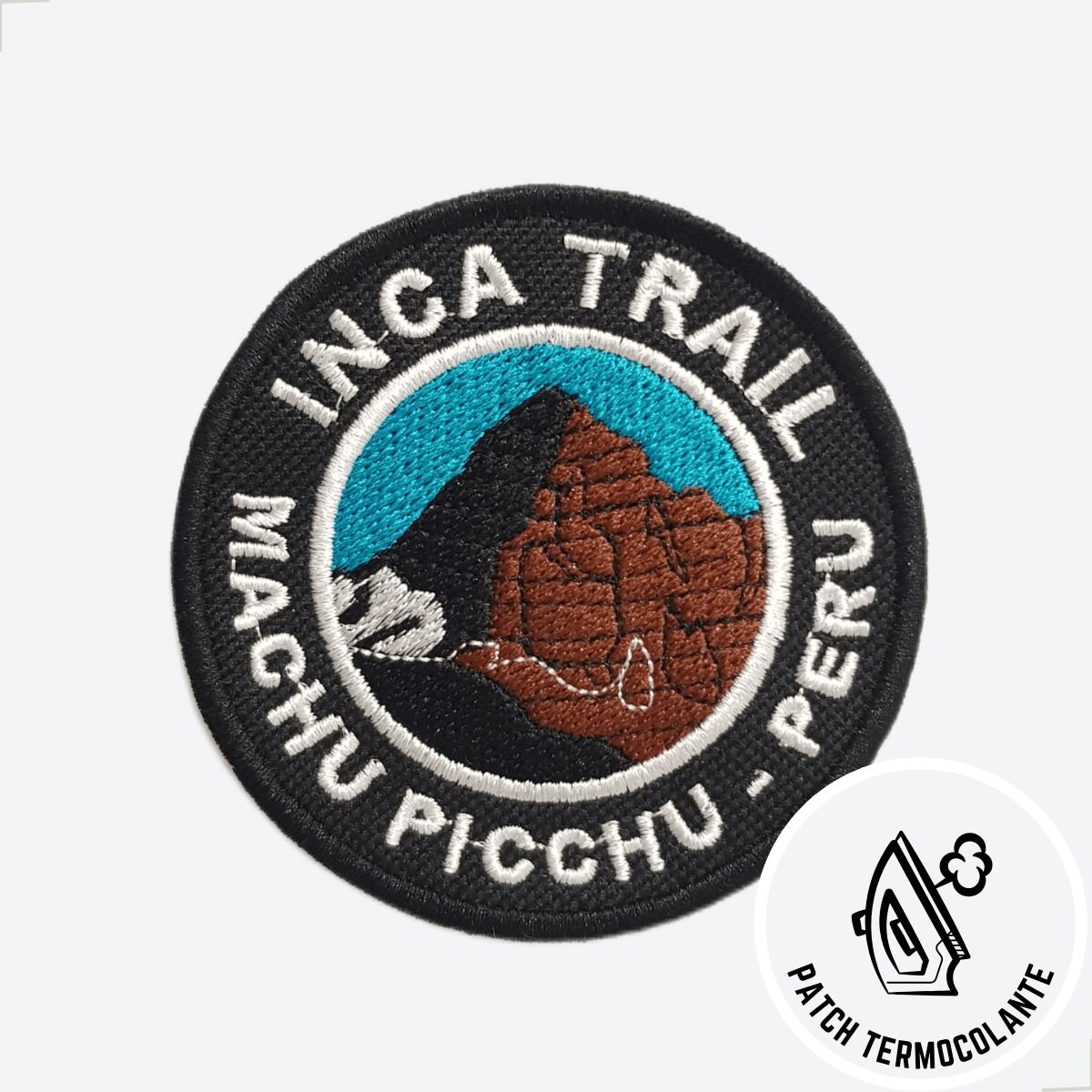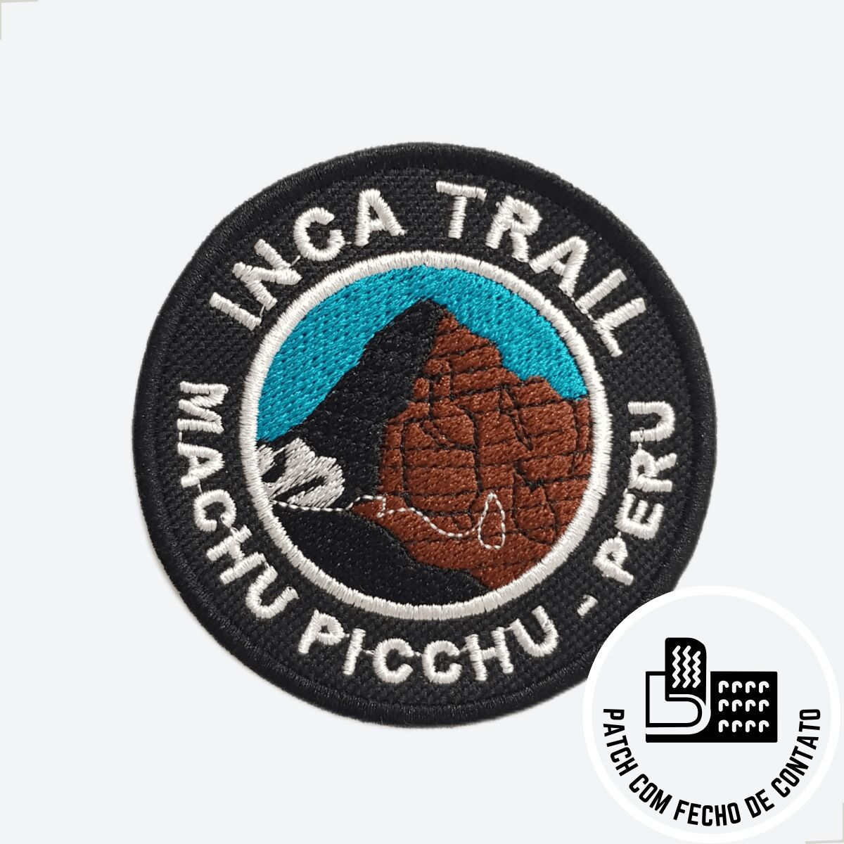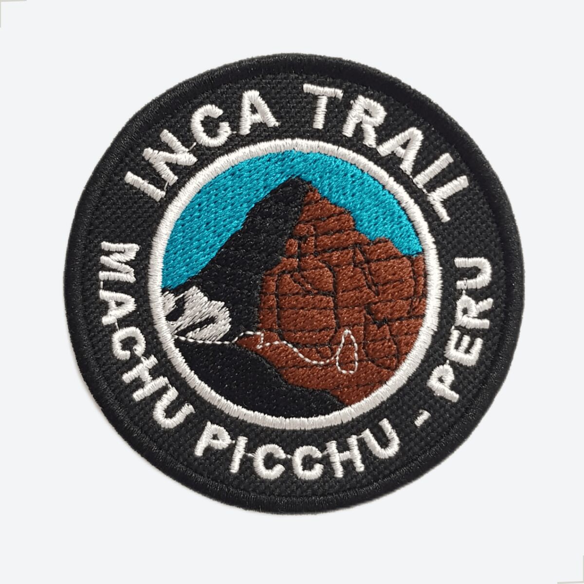 DESIGN EXCLUSIVO: Patch bordado circular com logotipo da Trilha Inca e Machu Picchu, em cores contrastantes de preto, turquesa e marrom