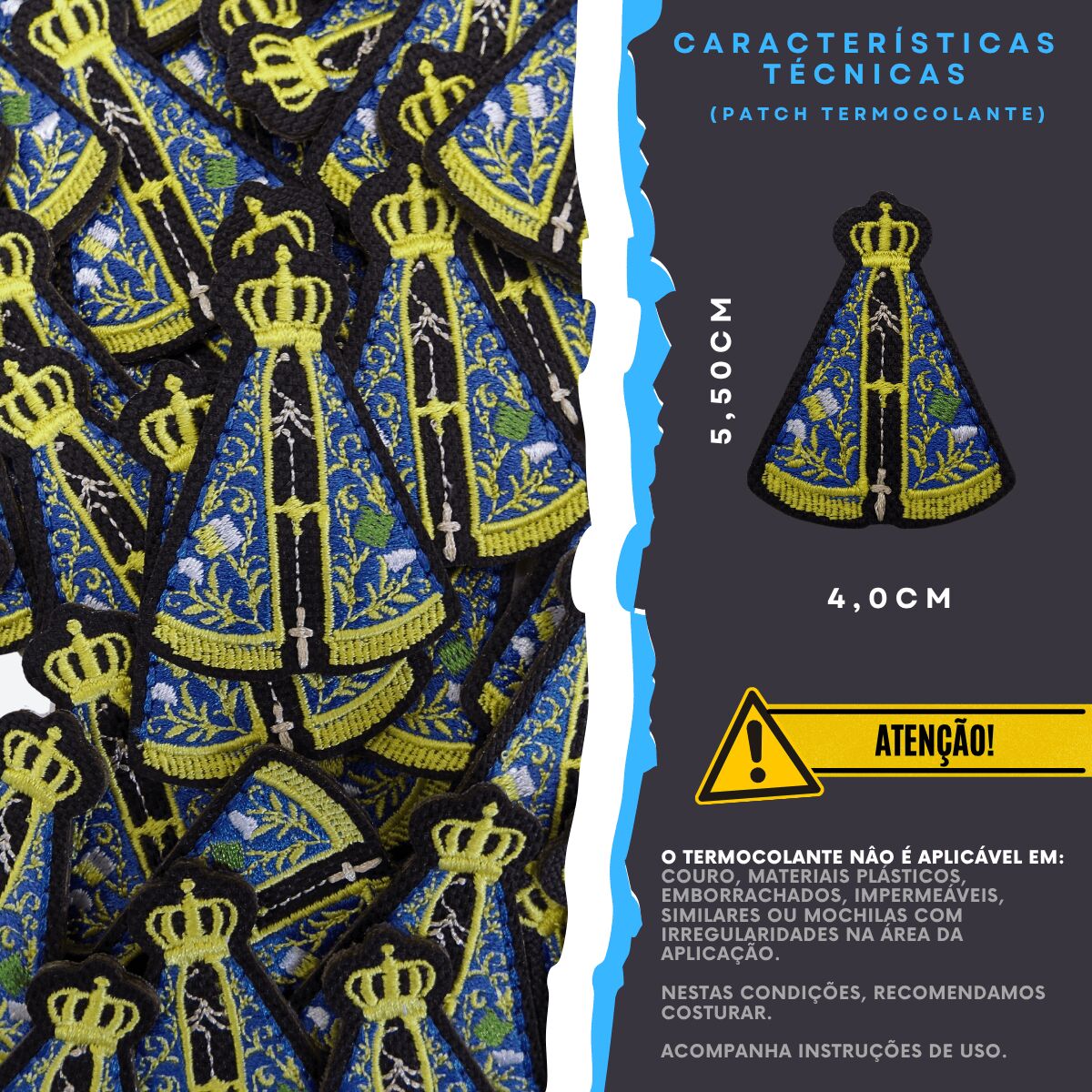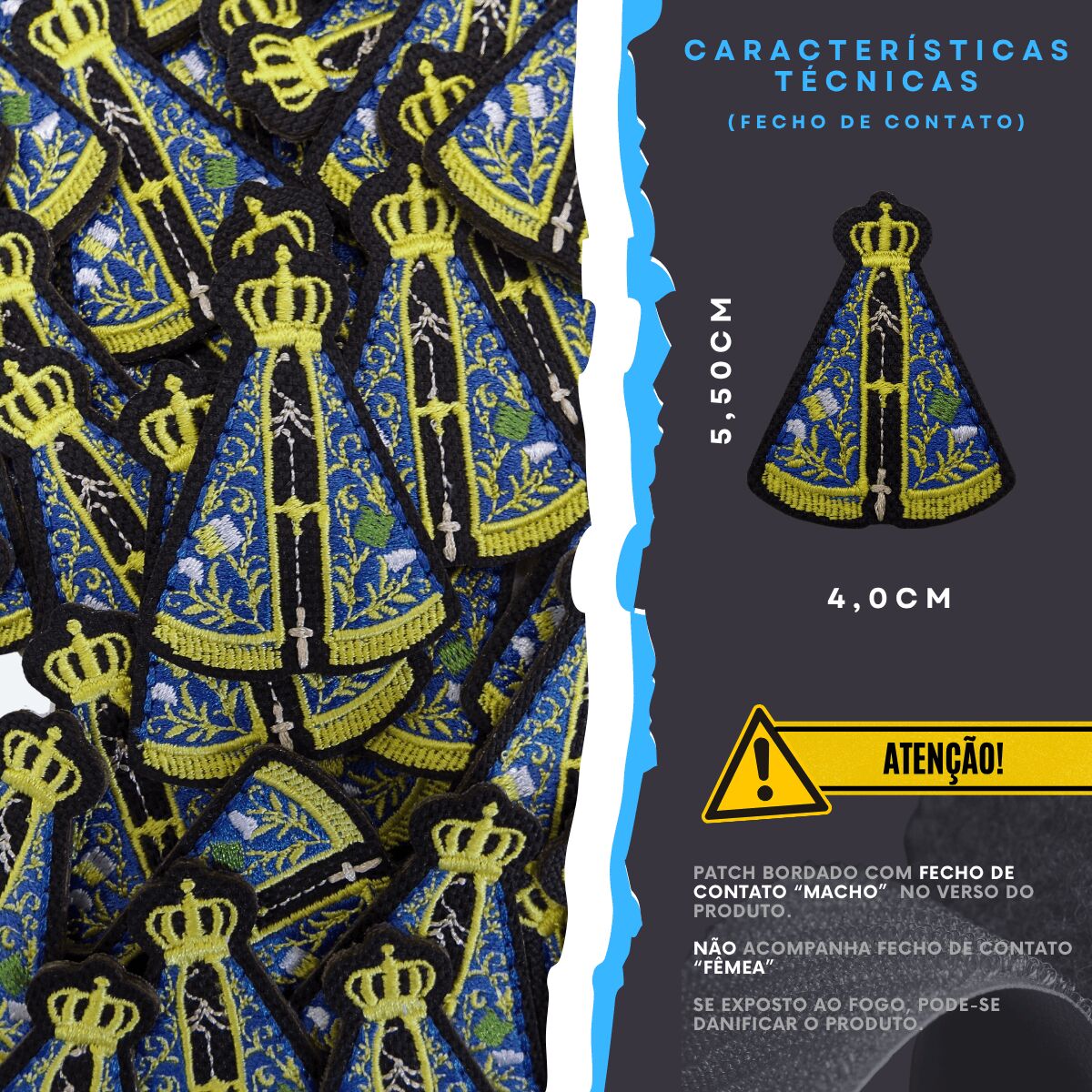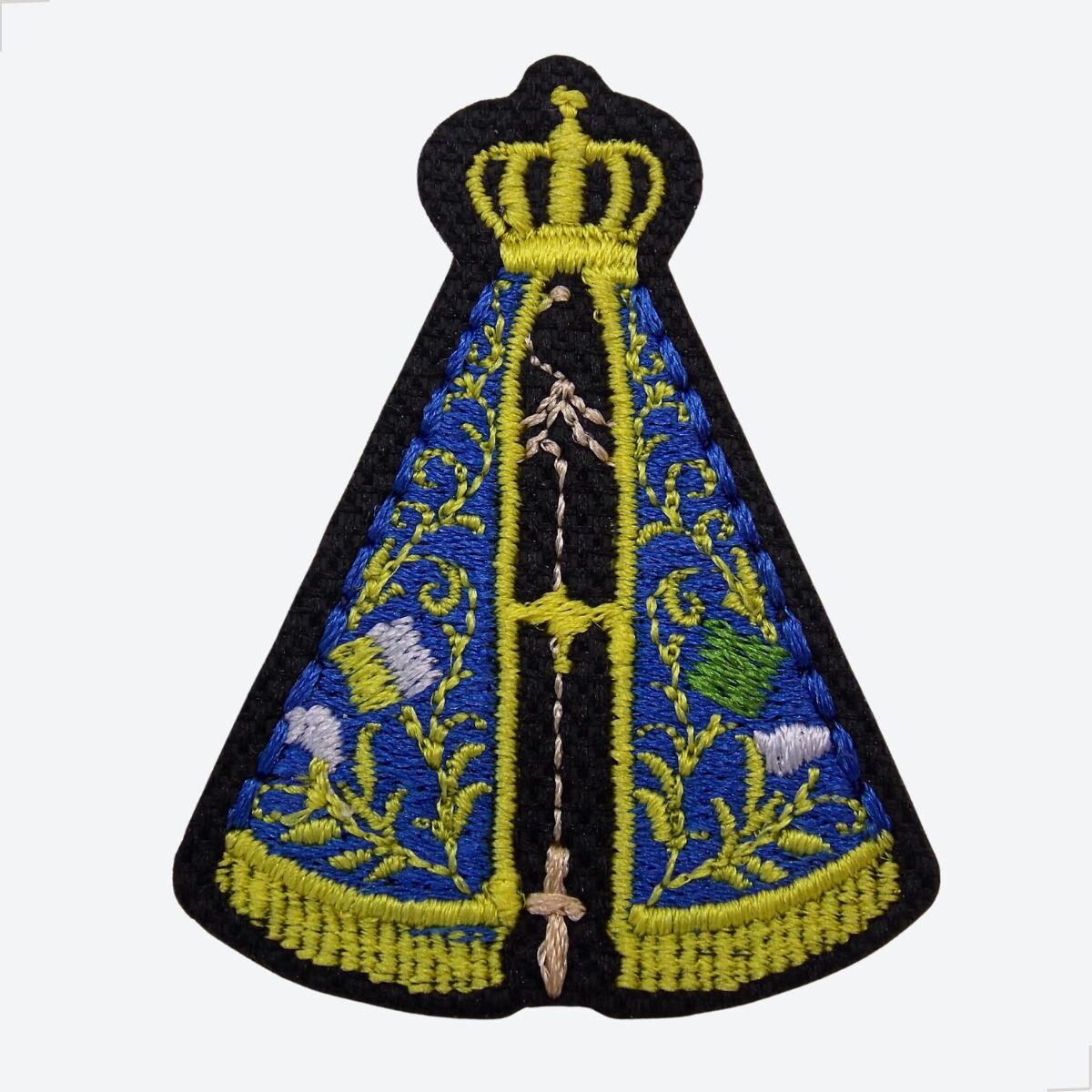 – DESIGN EXCLUSIVO: Patch bordado da Nossa Senhora Aparecida com detalhes em azul e dourado, apresentando uma coroa real no topo